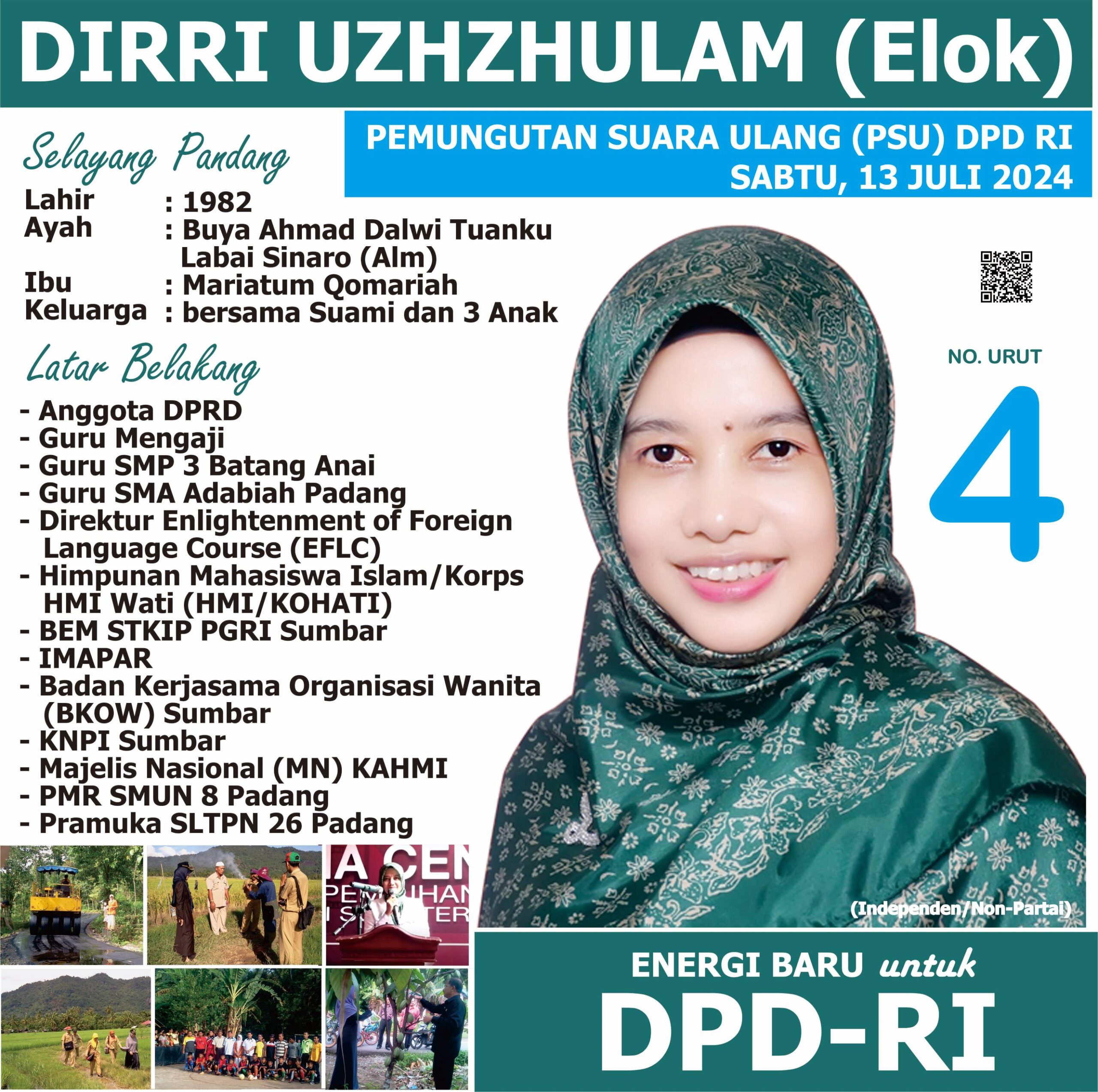Calon Senator muda yang enerjik dan berpengalaman baik bidang politik maupun organisasi, Dirri Uzhzhulam adalah anggota DPRD Padang Pariaman 2009-2014, guru mengaji, guru SMP III Batang Anai, guru SMA Adabiah Padang. Dan Alumni Himpunan Mahasiswa Islam.