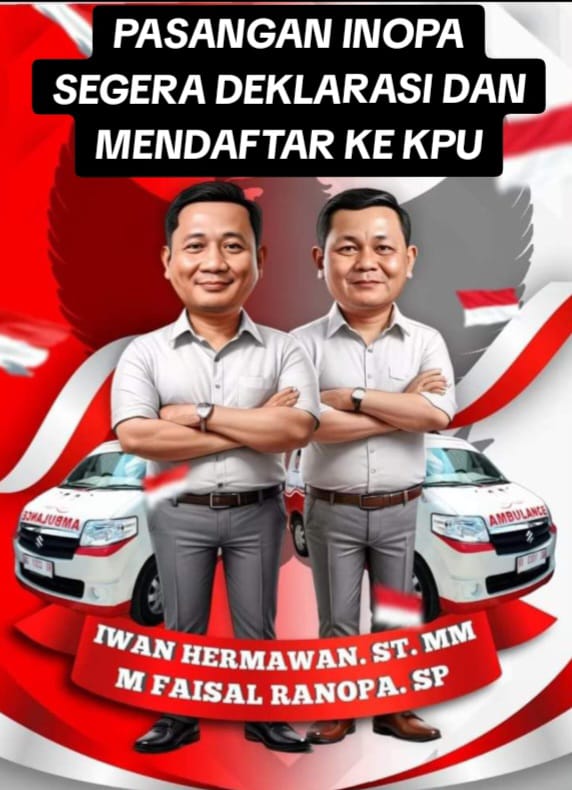 “Untuk partai pengusung, Alhamdulillah 100 % sudah halal, Pasangan INOPA diusung serta didukung oleh partai besutan dari Presiden terpilih kita yakni partai besutan H. Prabowo Subianto yaitu Partai Gerindra, selanjutnya pula ada Partai berlambang Ka’bah (PPP) yang saat ini diketuai oleh H. Mardiono”.