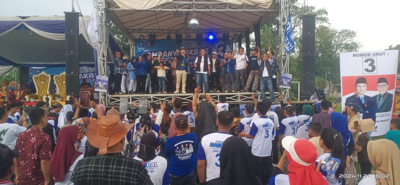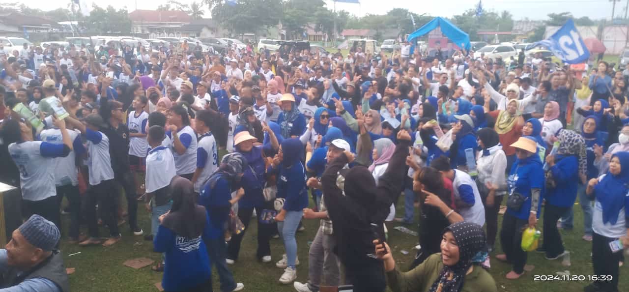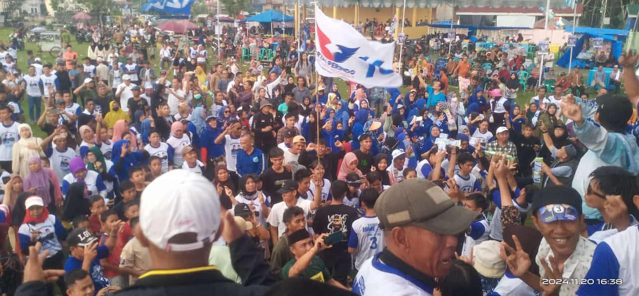 TULANGBAWANG (PI)- Lautan manusia hadiri kampanye akbar pasangan calon (Paslon) Bupati dan Wakil Bupati Tulangbawang, Hendriwansyah – Danial Anwar (Handal) nomor urut 03, kegiatan digelar di lapangan blok A, Kampung Ujunggunung Ilir, Kecamatan Menggala, kabupaten setempat, Rabu (20/11/24).