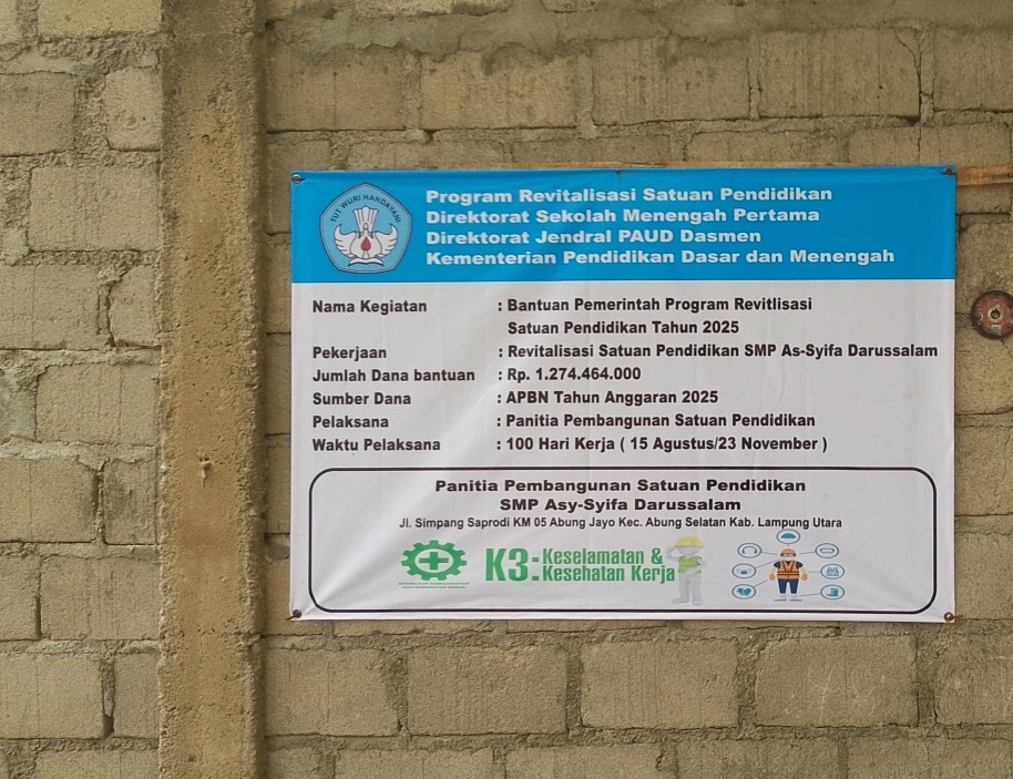 Lampung utara (PI) — Program revitalisasi satuan pendidikan direktorat sekolah menengah pertama direktorat jendral PAUD Dasmen kementrian pendidikan dasar dan menengah, Nama kegiatan: Bantuan pemerintah program revitalisasi satuan pendidikan tahun 2025, Pekerjaan Revitalisasai Satuan Pendidikan SMP ASY-SYIFA DARUSSALAM Jumlah Dana Bantuan : RP.1.274.464.000,- .Sumber Dana Bantuan : APBN Tahun Anggran 2025.Pelaksana: Panitia Pembangunan Satuan Pendidikan, Waktu Pelaksana: 100 Hari Kalender (15 Agustus/20 Nopember 2025} Diduga dikorupsi Berjamaah. (10/09/2025.).