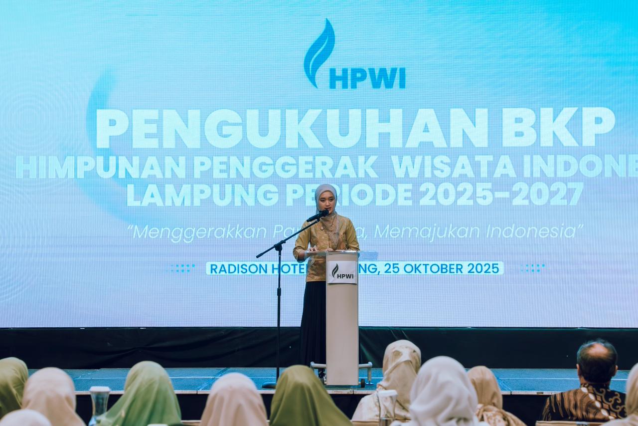 Bandar Lampung (PI) — Wakil Gubernur Lampung, Jihan Nurlela menghadiri Pengukuhan Badan Koordinasi Provinsi (BKP) Himpunan Penggerak Wisata Indonesia (HPWI) Lampung Periode 2025-2027 bertempat di Ballroom Hotel Radisson, Sabtu (25/10/2025).
